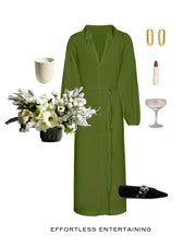 Go from prep to party in a look that doesn't require an entirely separate "getting ready" phase. The Dropoff Duster in Lush Leaf is the perfect planning, prepping then partying dress. Bonus: with an optional self-tie belt and easy fit, it's a great eating and drinking dress, too.